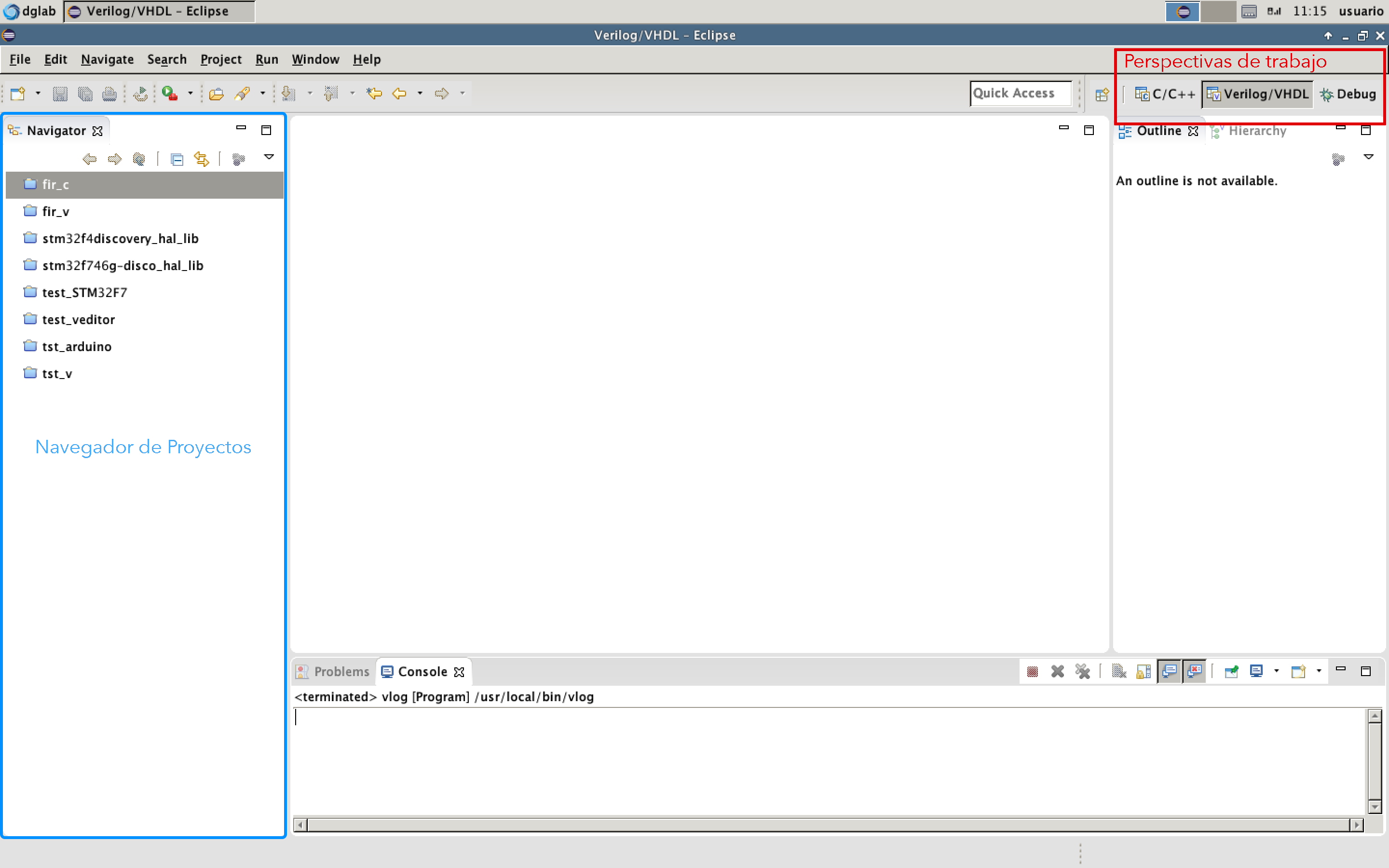 El navegador de proyectos sirve para desplazarse entre cada uno de los proyectos que se están desarrollando. A la derecha pueden encontrarse distintas perspectivas, que configuran la distribución de ventanas y de las herramientas que se muestran. Para el diseño digital trabajaremos con la vista Verilog/VHDL que nos elimina aquellos elementos correspondientes a la compilación y el testeo de aplicaciones escritas en C.