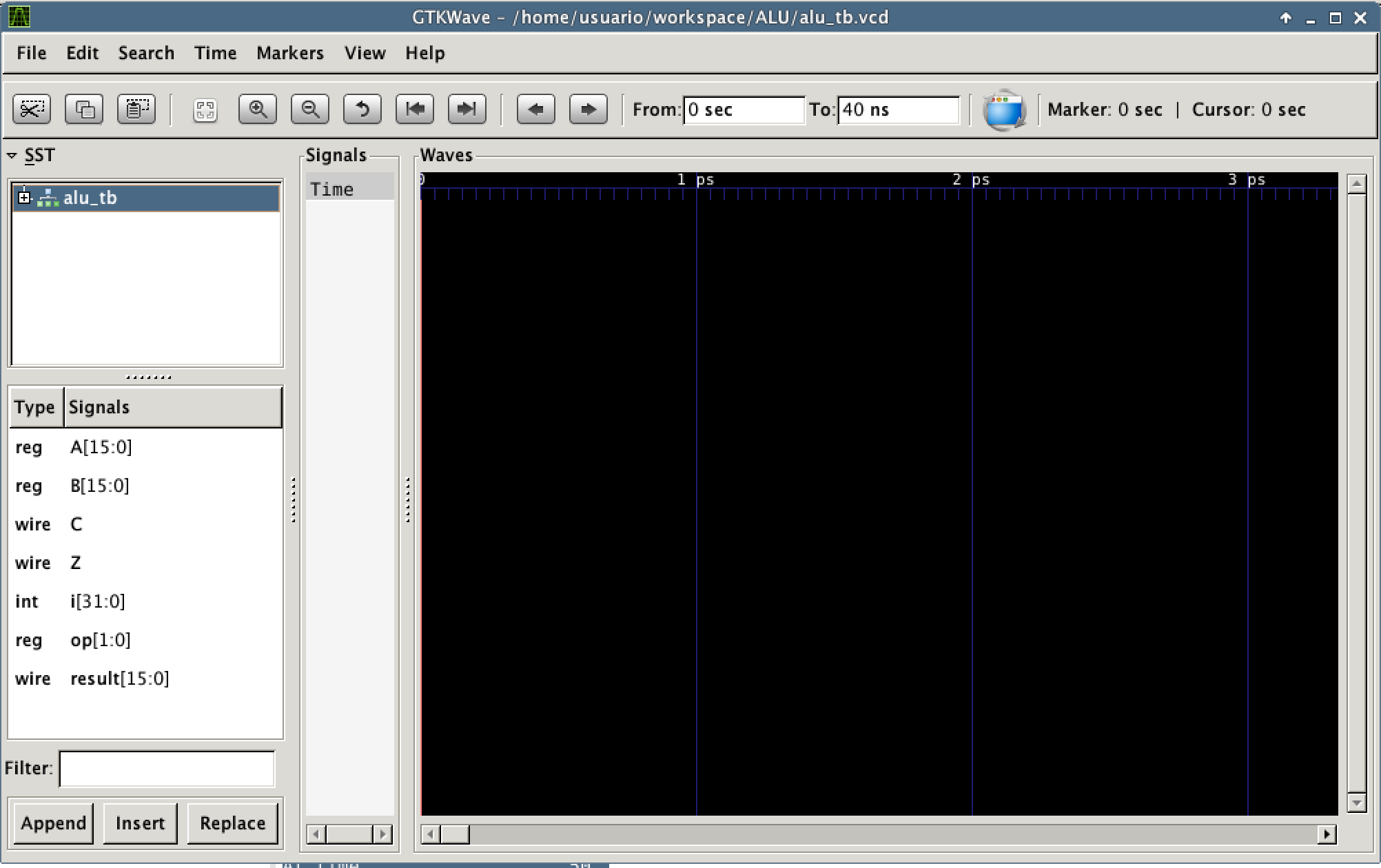 Para poder acceder al archivo, lo más sencillo es hacer click derecho sobre la carpeta del proyecto y refrescar el árbol de archivos. De este modo, los nuevos archivos generados (sources.txt, a.out y alu_tb.vcd) ya son accesibles desde el navegador de proyectos. Hacemos doble click sobre el archivo alu_tb.vcd, y se abre la aplicación GTKWave para visualizar los resultados. La ventana de la aplicación tiene el siguiente aspecto: