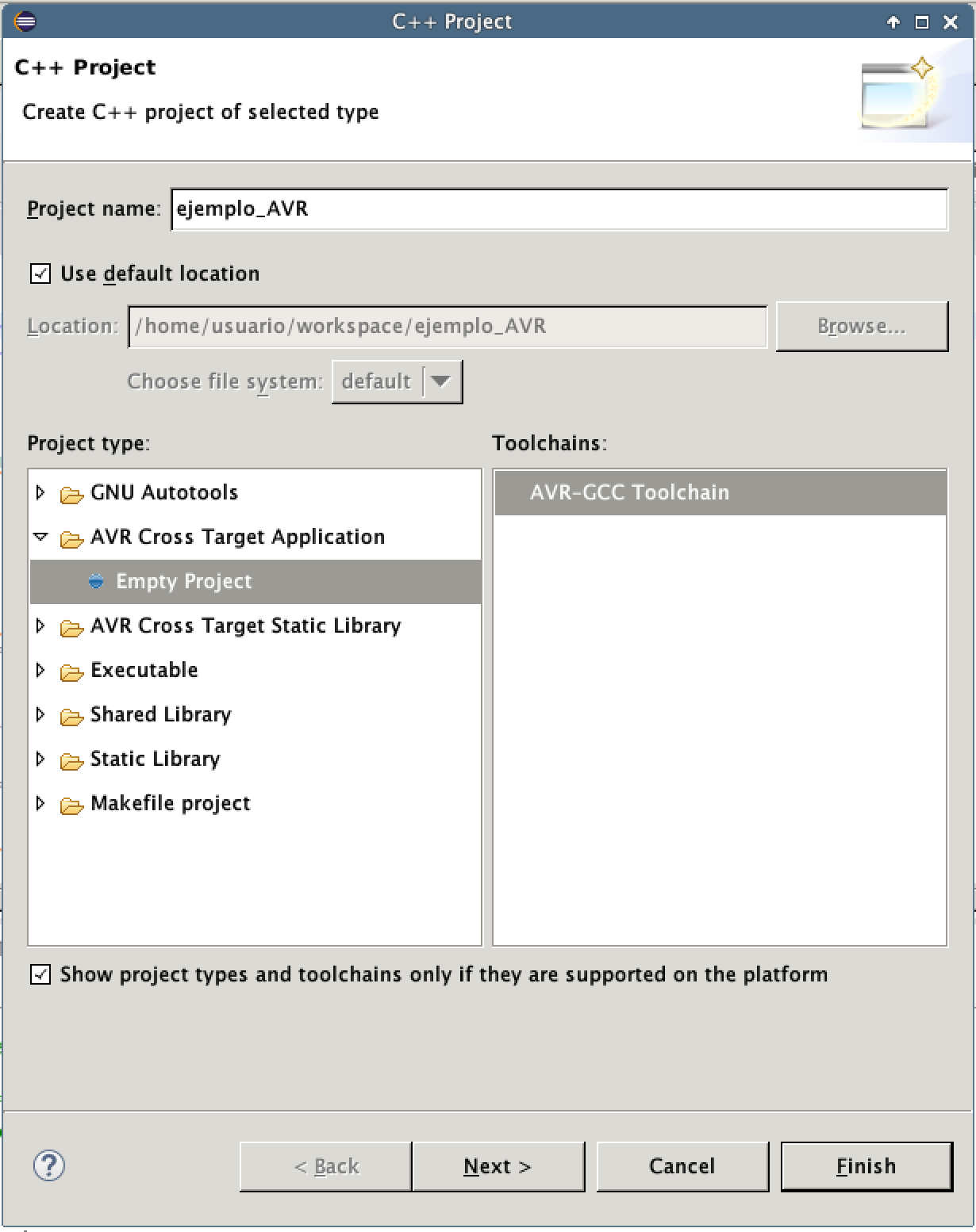 Para crear el proyecto en eclipse, debemos ir al menú File, hacer click sobre New y sobre C Project. En el tipo de proyecto, deberemos seleccionar AVR Cross Target Application, tal y como se muestra en la siguiente figura.
