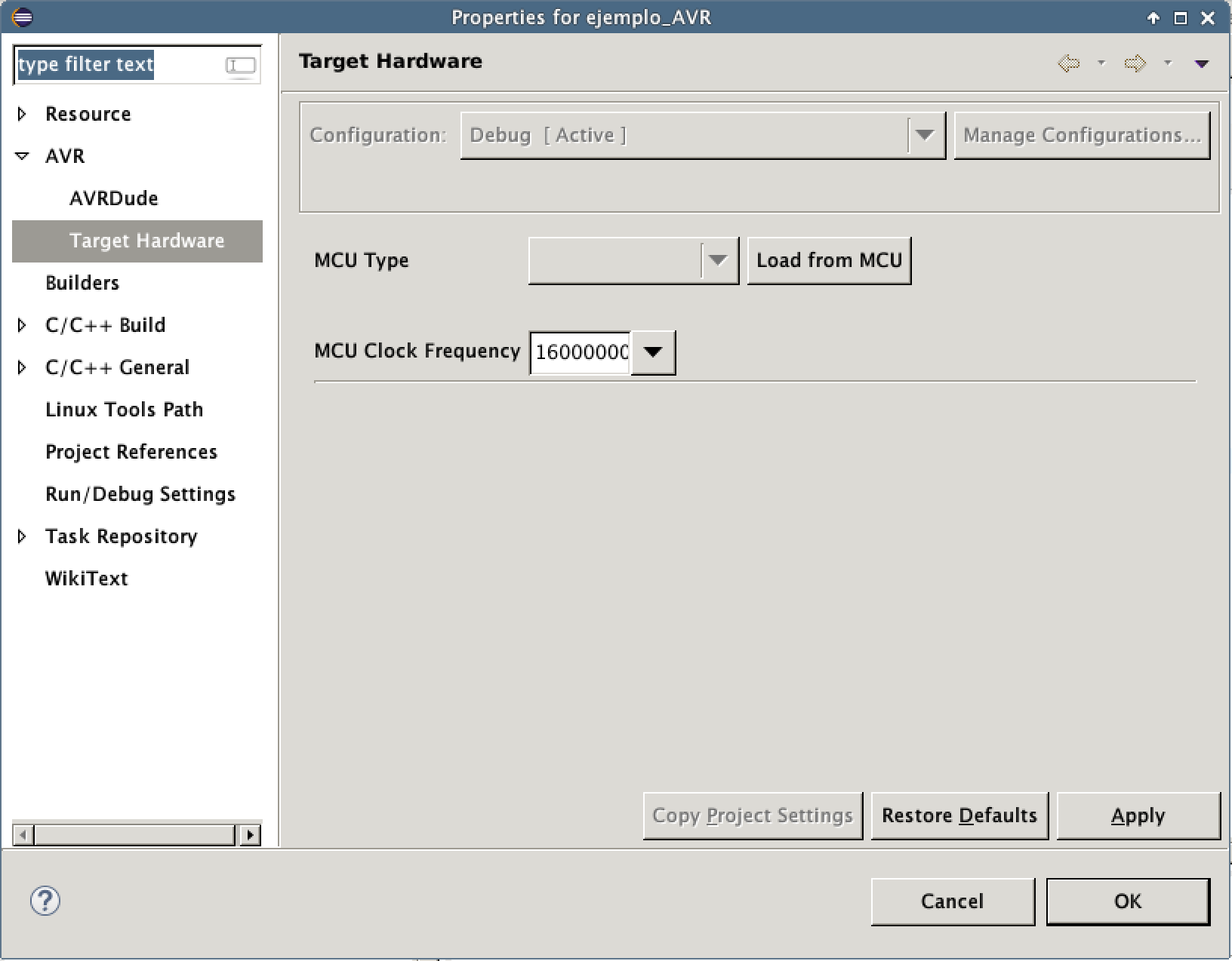 Además del código del programa principal, es necesario especificar el chip a programar y ajustar los bits de configuración (Fuses) del microcontrolador. Para ello, Eclipse dispone de una interfaz gráfica para la edición de los Fuses, a la que se puede acceder haciendo click derecho sobre el proyecto, en propiedades, y navegando hasta la siguiente ventana.