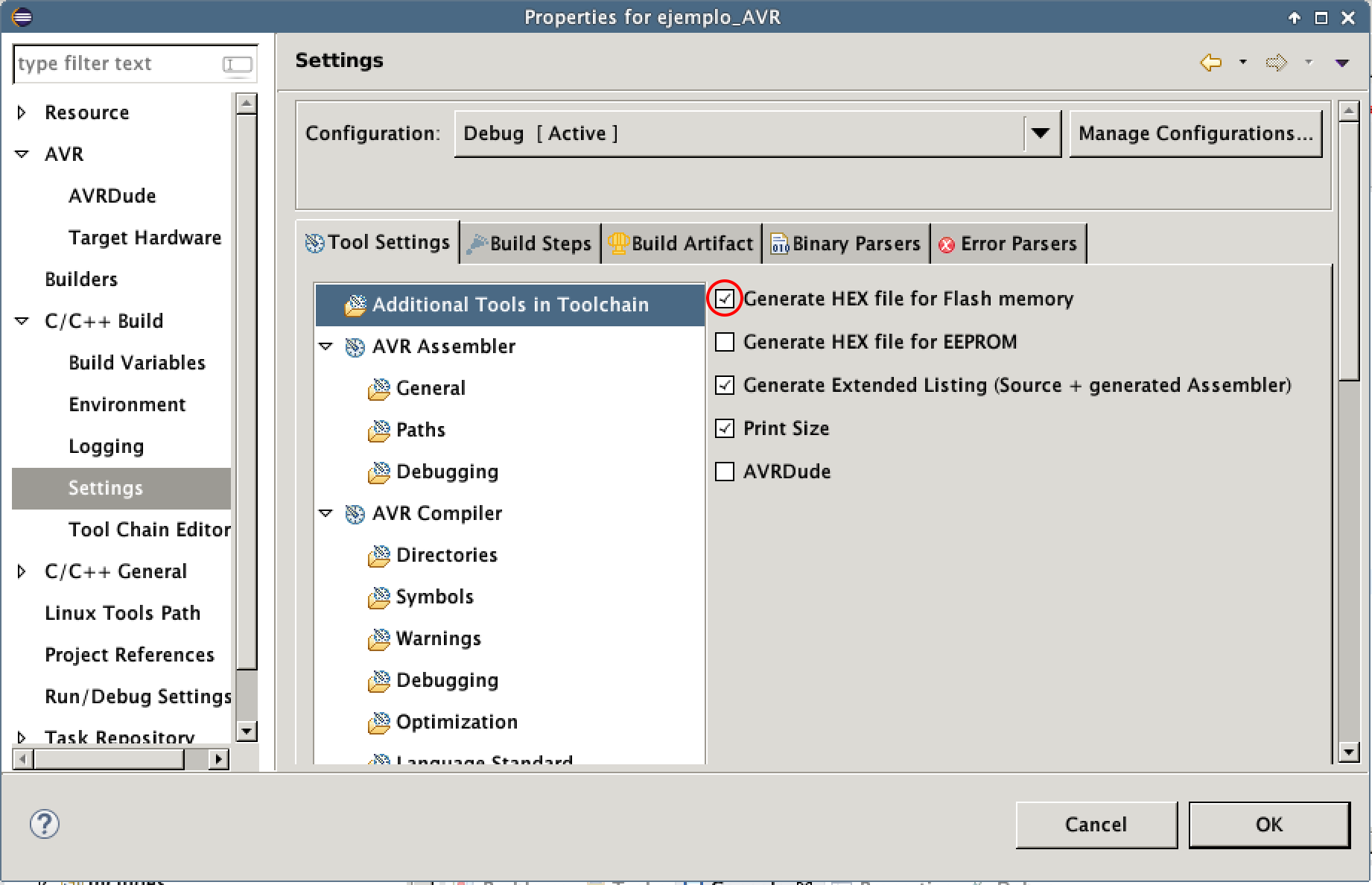 Si recibiésemos un mensaje diciendo que no ha encontrado el archivo .hex significa que se está generando el .elf al construir el proyecto, pero no el .hex. Para solventar el problema basta con entrar en la configuración y habilitar la siguiente casilla.