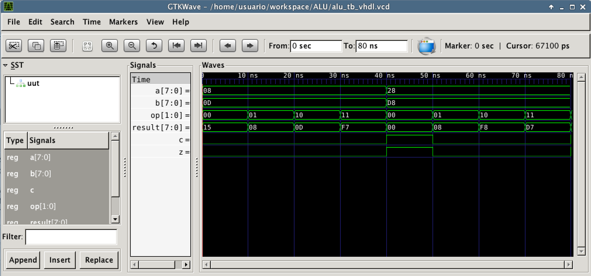 Tras ejecutar el comando, aparecerá el fichero alu_tb_vhdl.vcd en el directorio de trabajo. Basta con hacer doble click sobre el para abrir GTKWave y examinar el resultado de la simulación, que se muestra a continuación: