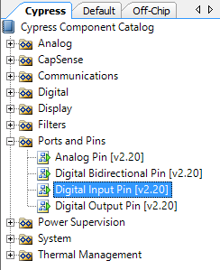 Para insertar los pones, la ventana de componentes debe tener seleccionada la pestaña Cypress, y obtenemos los pines de entrada y salida de la carpeta Ports and Pins.