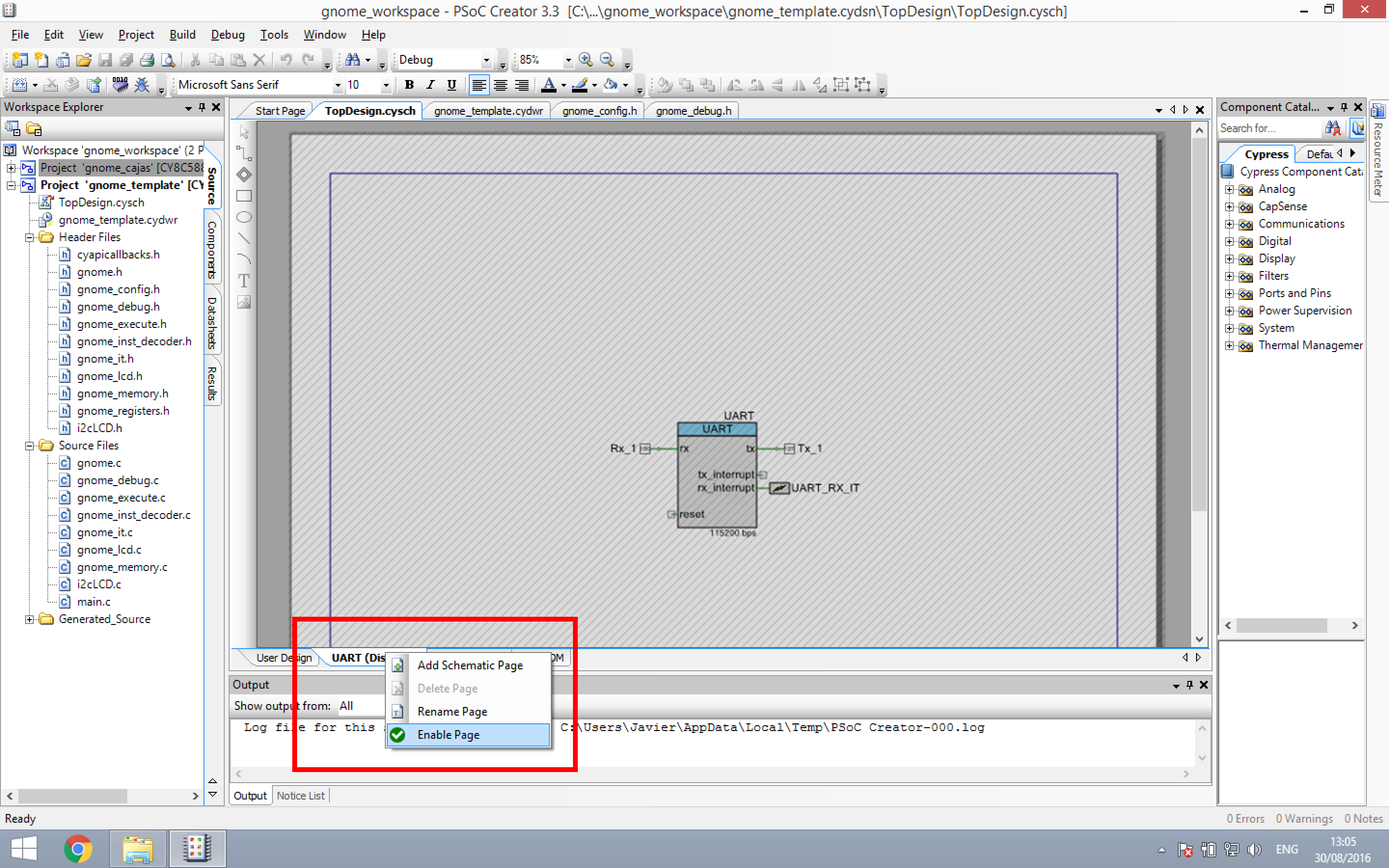 ADVERTENCIA: Mientras el depurador se encuentre activo, será necesario activar síntesis de la UART en la lógica programable. Para ello se debe activar la segunda página del TopDesign.cysch.