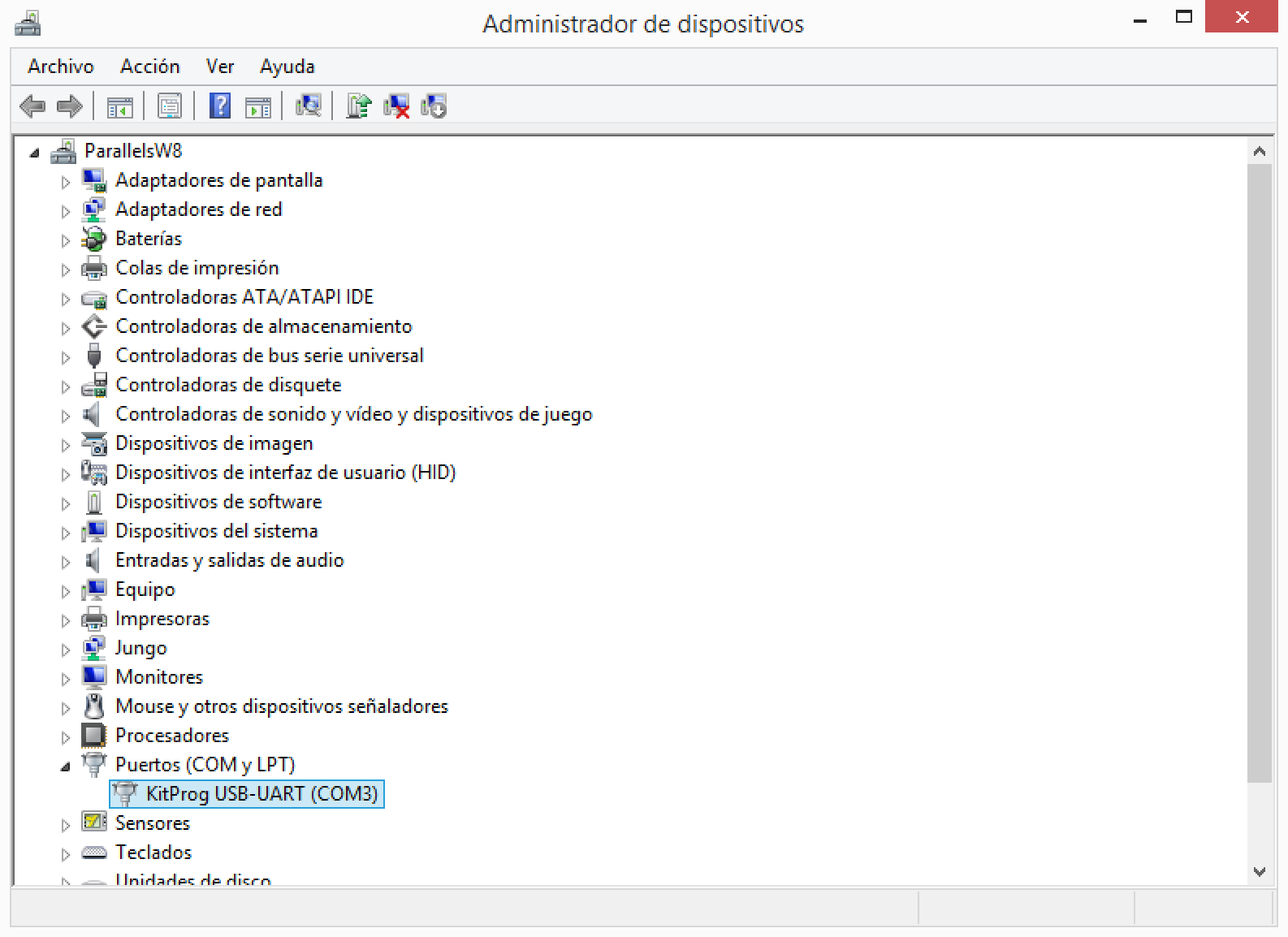 Necesitaremos comprobar qué puerto virtual se ha asignado al PSoC. Para ello, simplemente abrimos el Administrador de dispositivos de Windows (Si no sabes cómo hacerlo, búscalo en Internet). Desplegamos la categoría Puertos (COM y LPT) y veremos el KitProg USB-UART asignado a un puerto COM.