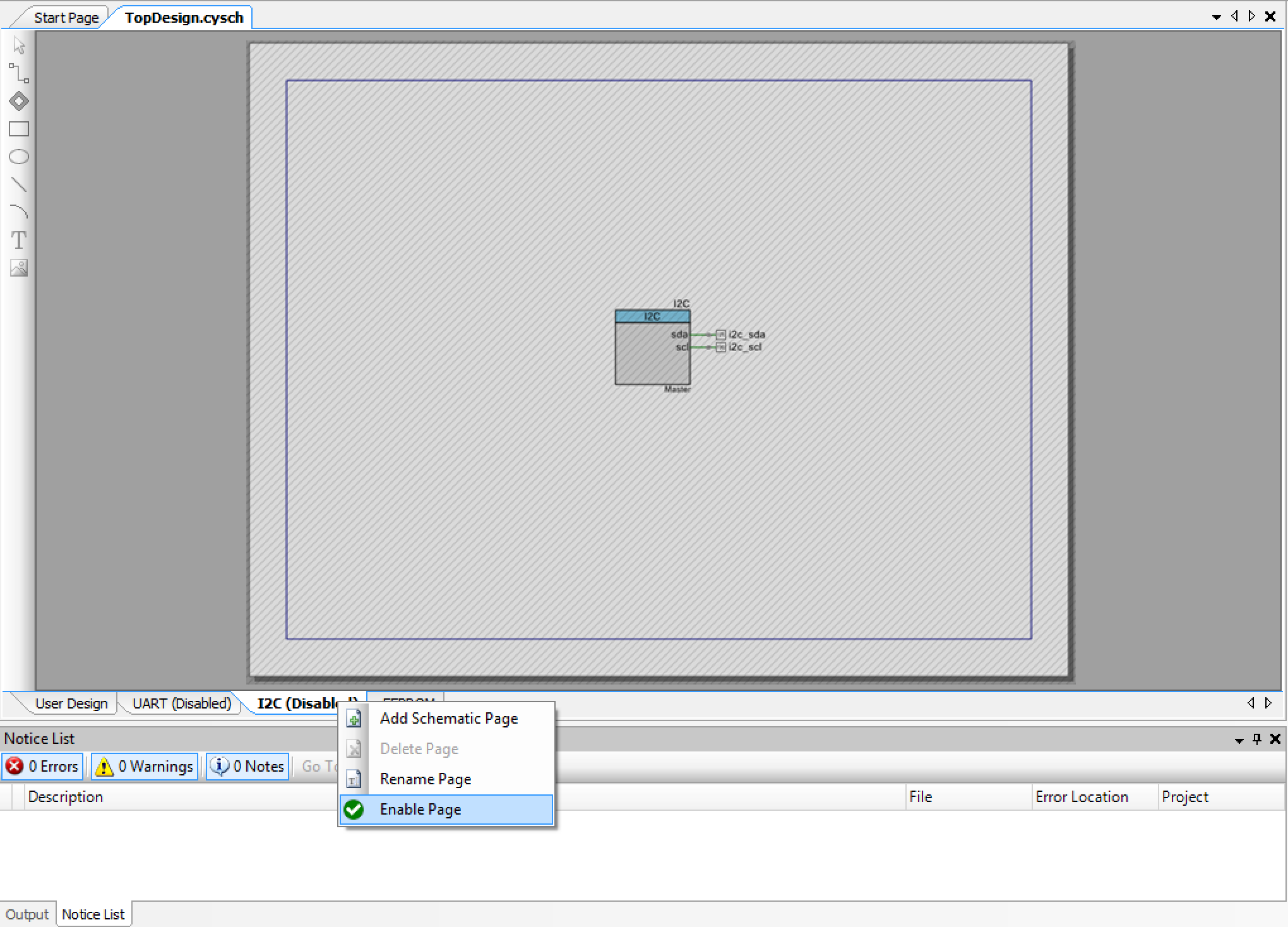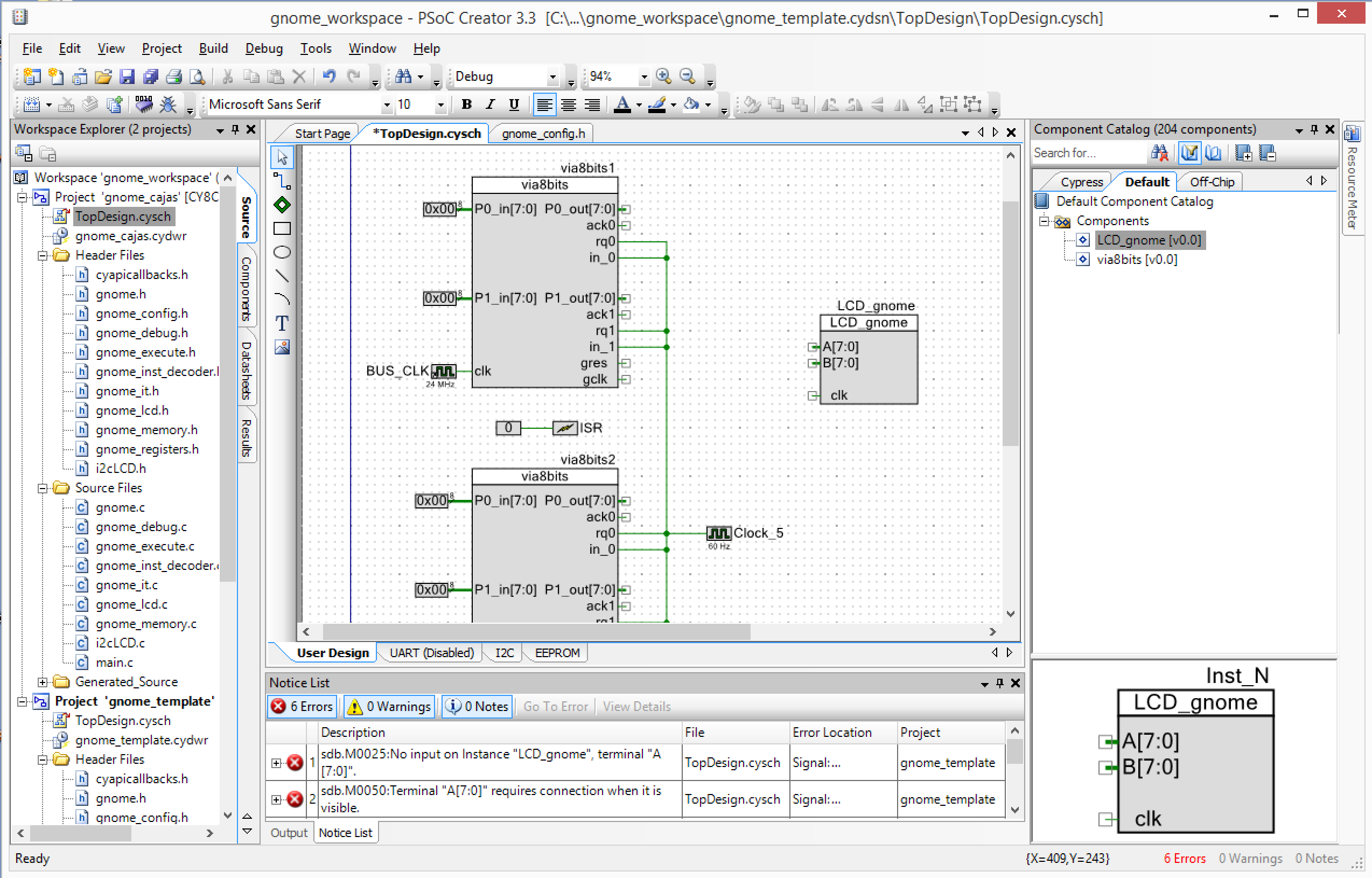TopDesign.cysch) el módulo LCD que se puede encontrar en el catálogo de componentes, en la pestañaDefault.